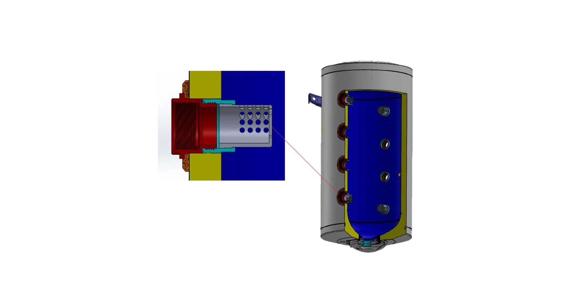 Pentru a putea fi utilizat cu o pompă de căldură, acest rezervor tampon este prevăzut cu o deschidere de tip AV pe cupola superioară, de tip G ½", care permite conectarea la sistemul de pompă de căldură.