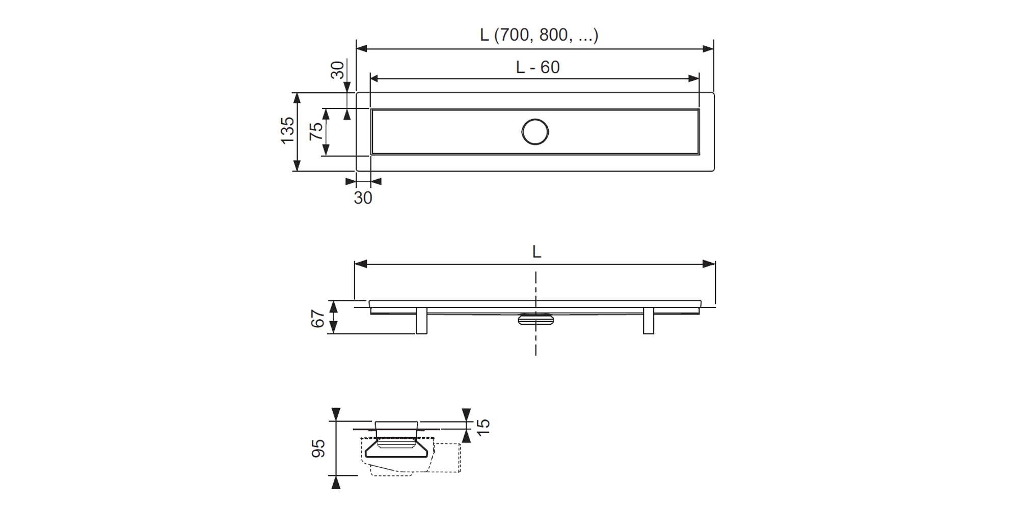 - Dimensiuni ideale – Cu o lungime totală de 900 mm și o lățime de 135 mm în stare brută, rigola oferă o suprafață vizibilă de 840 x 75 mm după instalare, păstrând un aspect minimalist și discret.