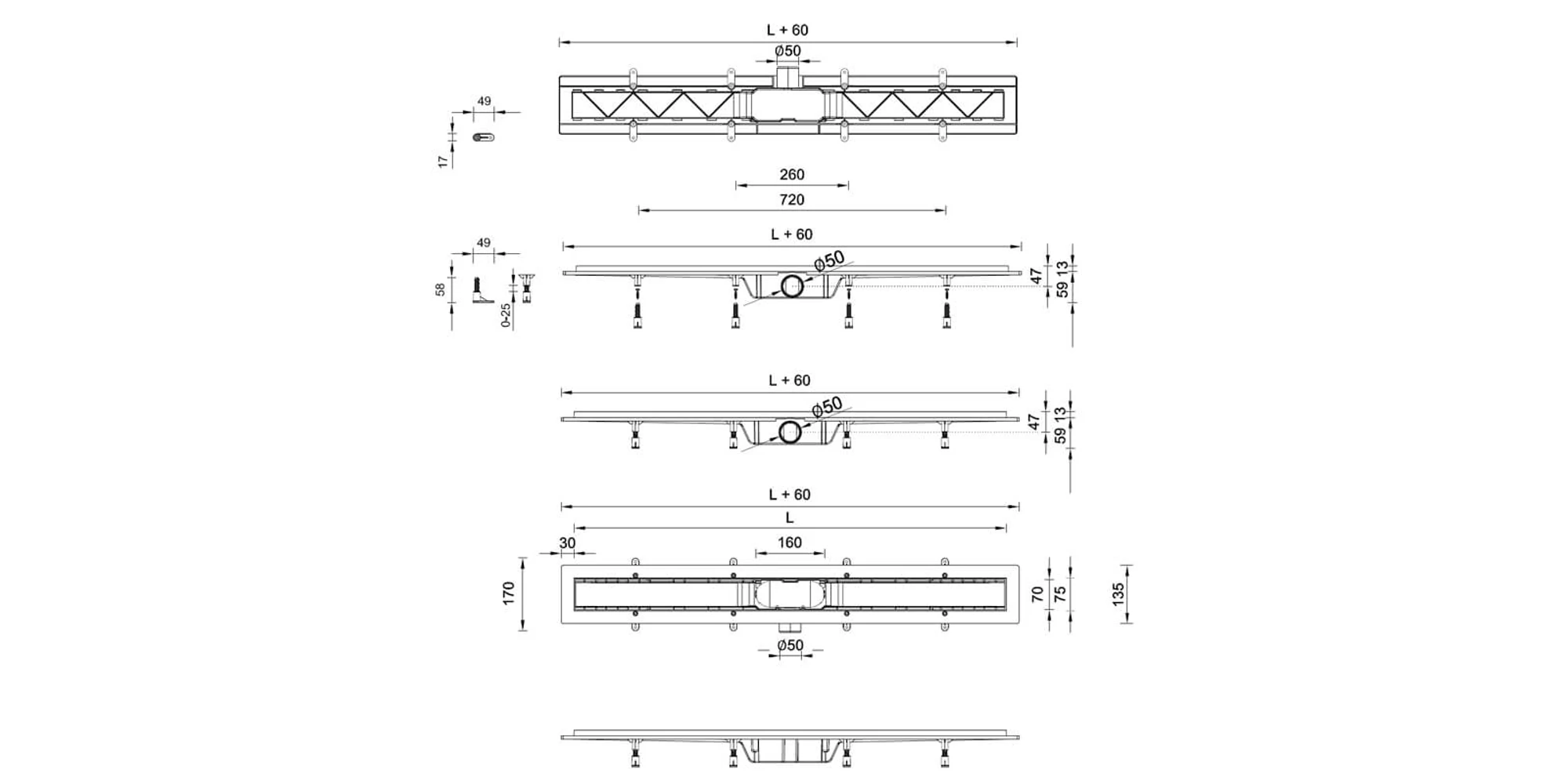 - Rigolă de duș drept pentru utilizare în interior.