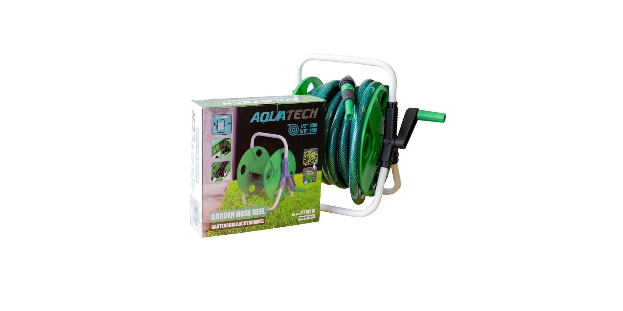 Rola pentru furtun grădină 1/2" – 35 m, 5/8" – 25 m AQUATECH are două funcții, poate fi utilizat ca un tambur pentru depozitarea furtunului și poate fi utilizat ca dispozitiv de transport al furtunului.