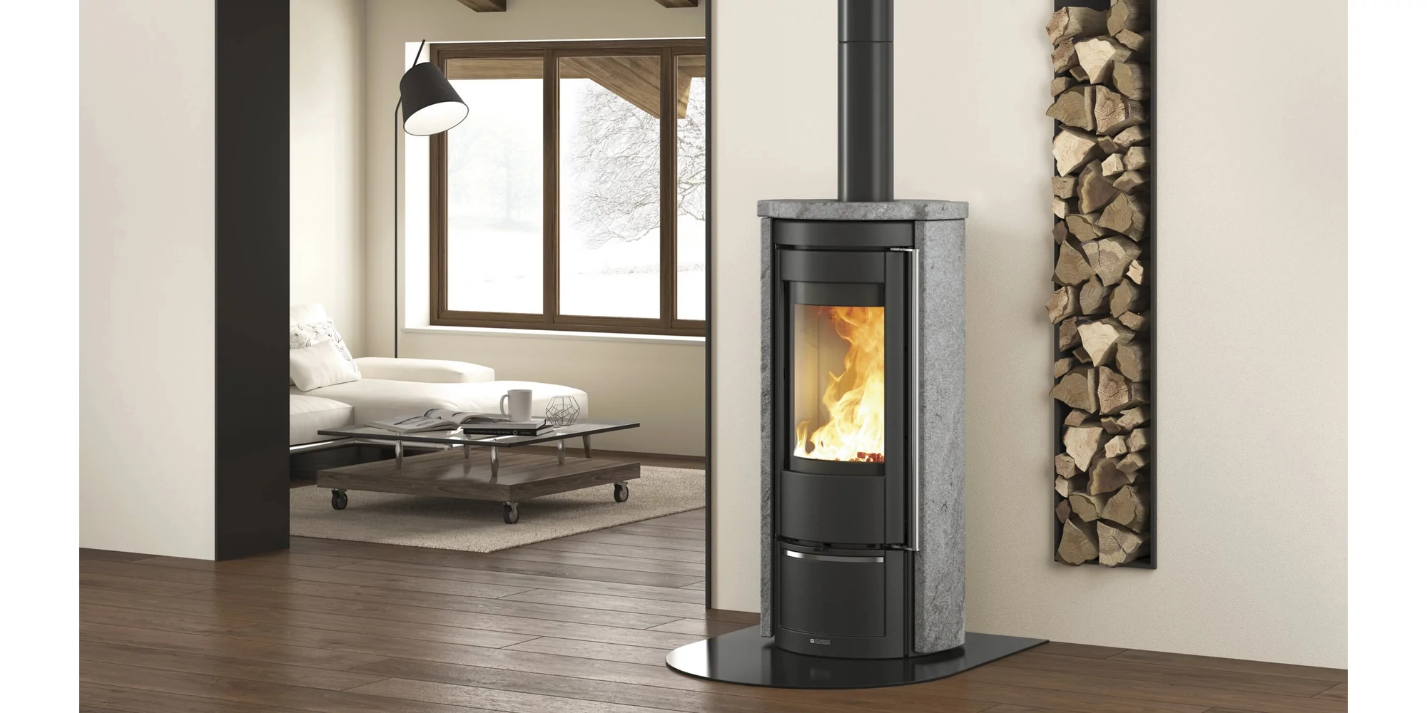 Șemineu pe lemne, 7.5 kW, pentru 215 m3, cu geam panoramic curbat de mare dimensiune, suprafață din piatră naturală, LIU' 5.0 PETRA, La Nordica-Extraflame