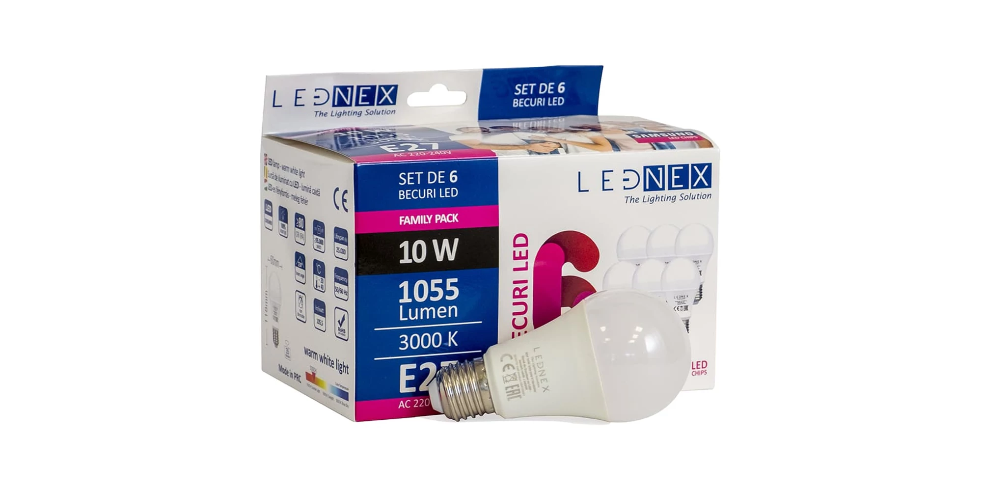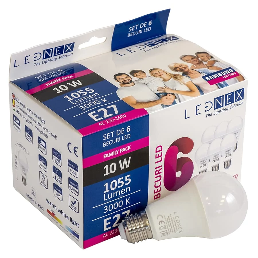 Set de 6 becuri LED, E27 10W 3000K, A60 LEDNEX conține 6 surse de iluminat cu LED, cu lumina caldă de 3000K și soclu tip E27. Clasa de energie este A+.