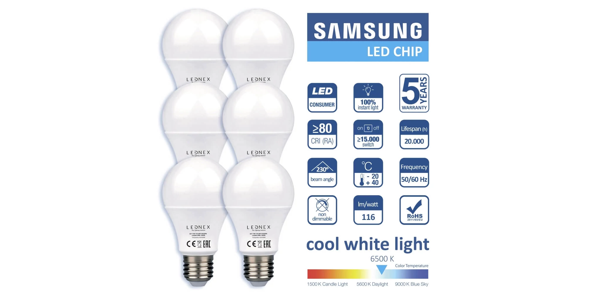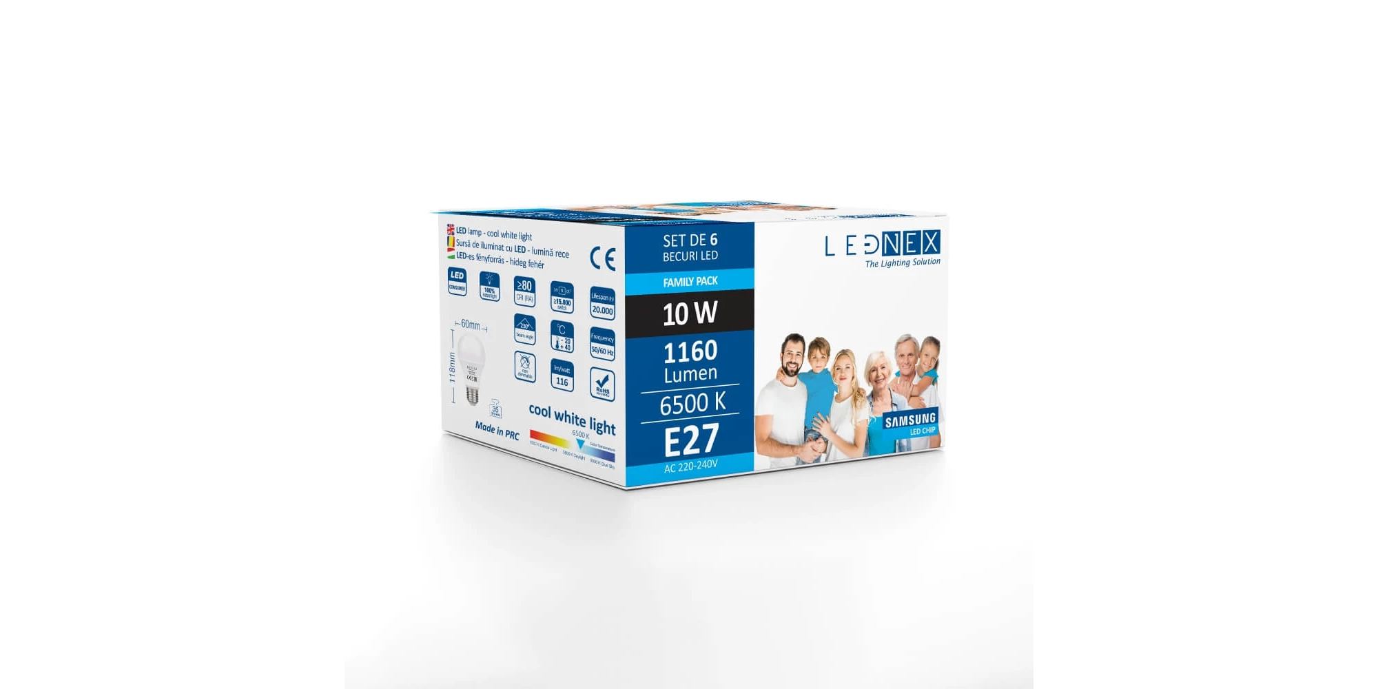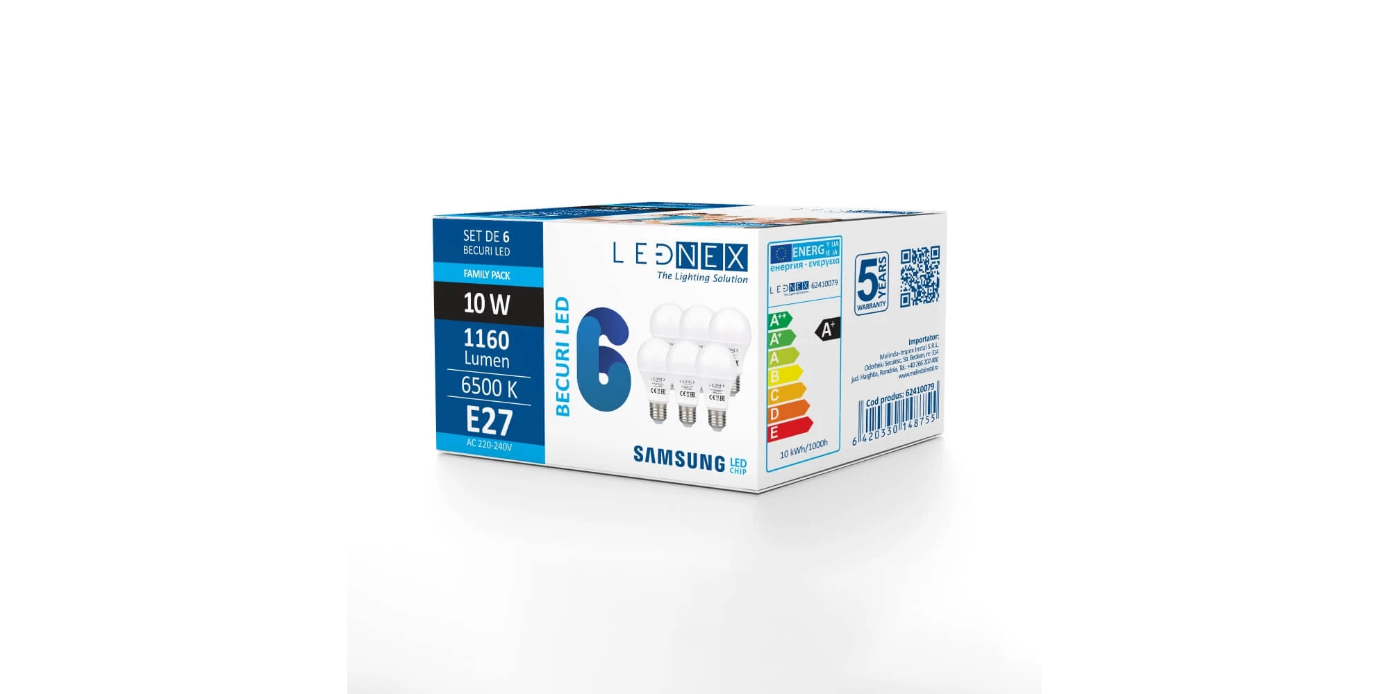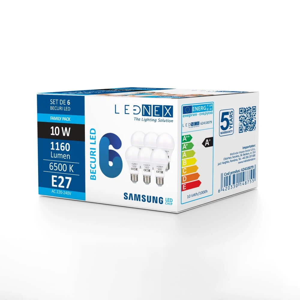 Setul de 6 becuri LED, E27 10W 6500K, A60 LEDNEX conține 6 surse de iluminat cu LED, cu lumina caldă de 6500K și soclu tip E27. Clasa de energie este E. Este ideal pentru gospodării familiale, unde schimbarea frecventă a becurilor poate fi des întâlnită. Este fabricat cu chip Samsung, beneficiază de 5 ani de garanție și este în conformitate cu directiva RoHS 2011/65/EU.