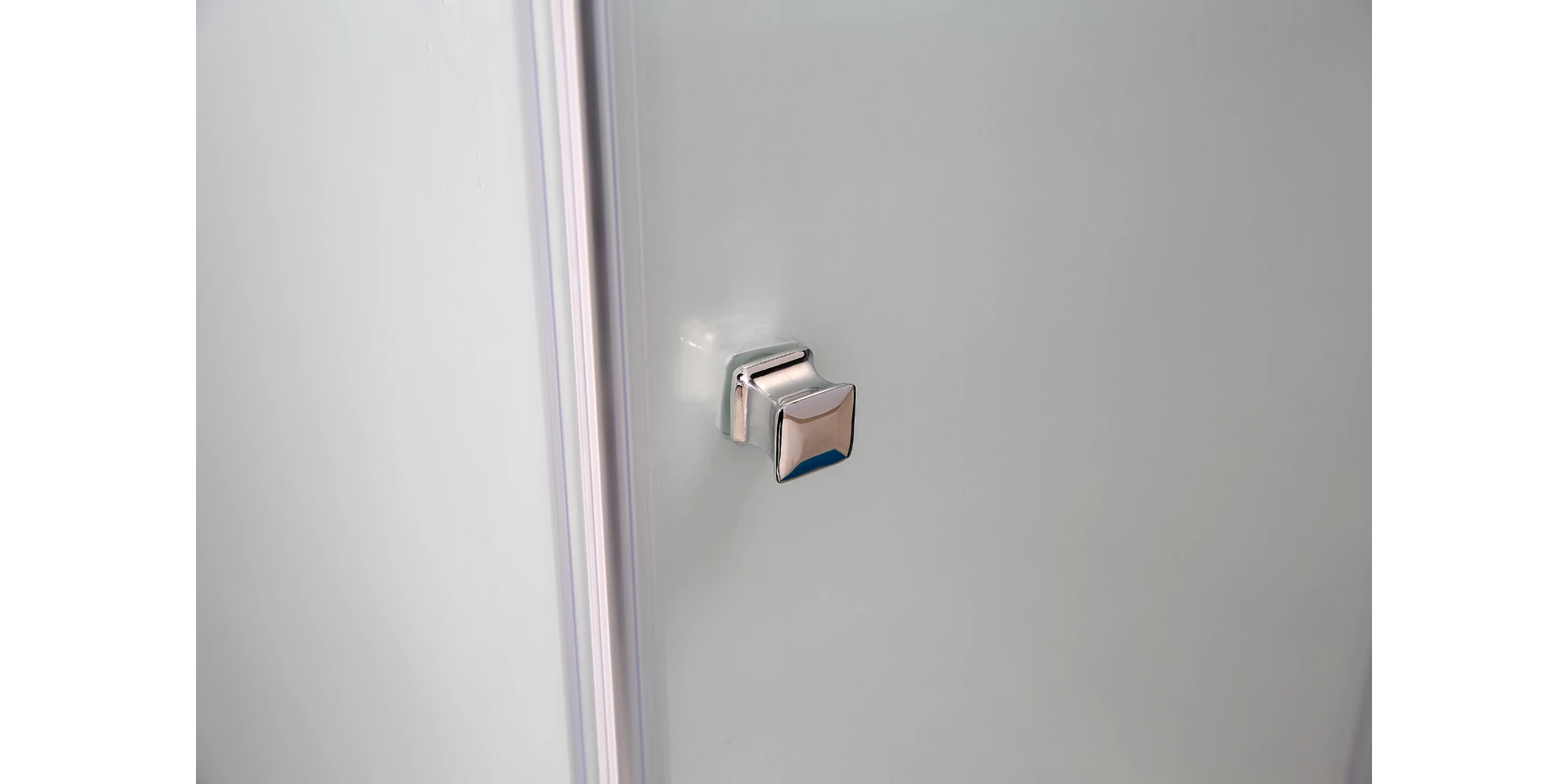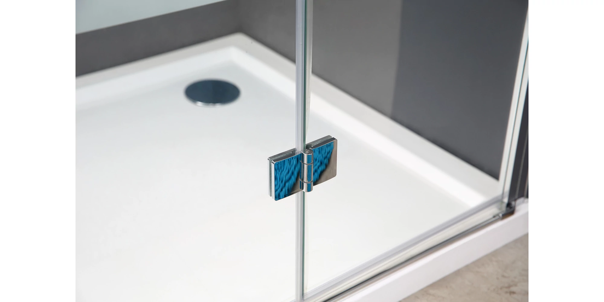 Bara de susținere din oțel inoxidabil asigură rigiditatea întregului ansamblu. Balamalele din aliaj de zinc cu capac cromat sunt robuste și susțin ușa pivotantă cu precizie. Mânerul unic din ABS este ergonomic și confortabil pentru utilizare zilnică. Etanșeizarea este gândită pe două niveluri: banda impermeabilă din aluminiu montată la baza cabinei împiedică infiltrațiile, iar garnitura din plastic aplicată pe margini asigură izolarea completă față de suprafețele adiacente.
