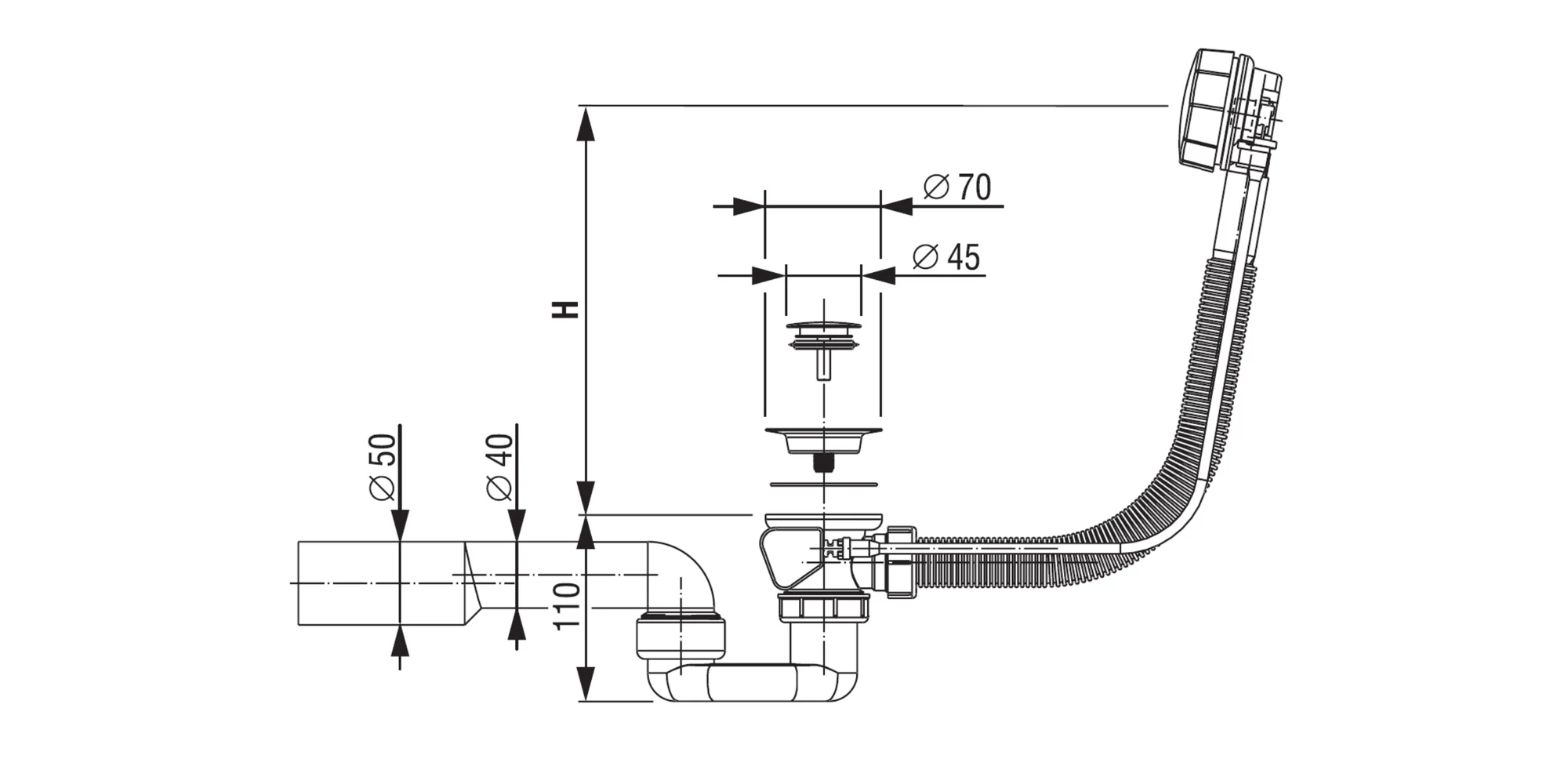- Compatibilitate – se potrivește la căzi cu deschidere Ø 50 mm și la instalații cu țeavă Ø 40/50 mm;