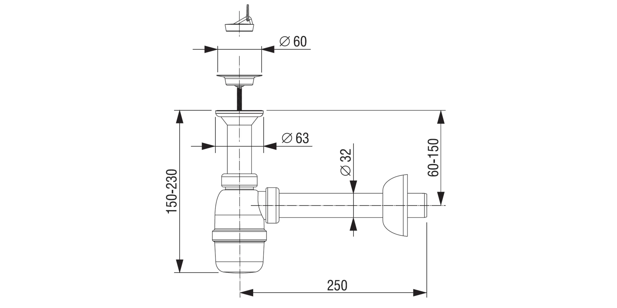 Grila metalică inoxidabilă de Ø 60 mm acoperă orificiul lavoarului și reține impuritățile mai mari, protejând scurgerea. Dopul din plastic îți permite să oprești scurgerea când ai nevoie să umpli chiuveta. Diametrul țevii de scurgere de Ø 32 mm asigură un debit ridicat al apei, astfel încât lavoarul se golește rapid, fără stagnări și mirosuri neplăcute.
