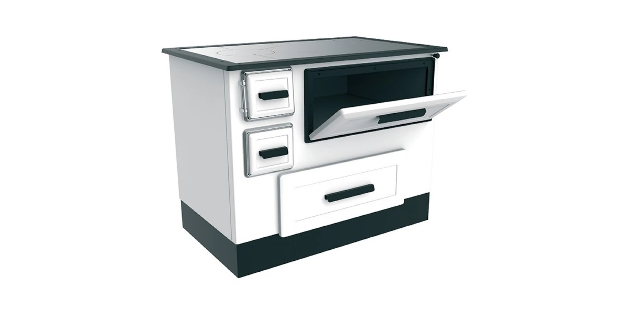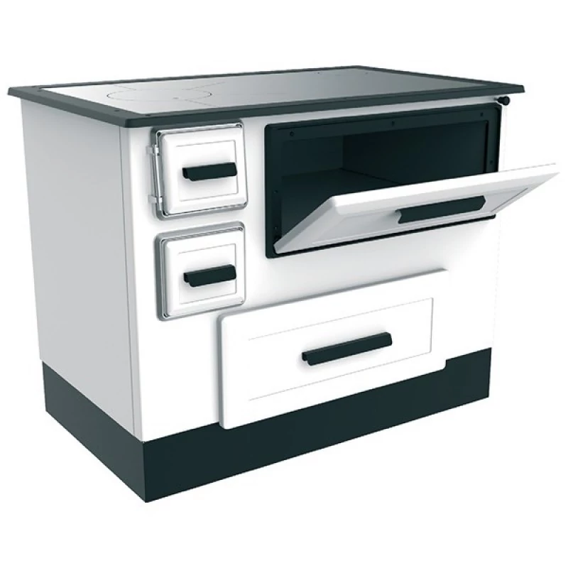 Cu un sertar ușor de mutat destinat depozitării combustibilului în partea inferioară a sobei, utilizatorii beneficiază de o gestionare comodă a resurselor de ardere. Cuptorul generos, cu un volum de 58 litri, permite pregătirea în cantități mari, garantând astfel prăjirea uniformă a alimentelor.