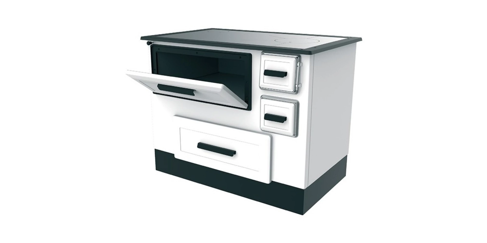 Cu un sertar ușor de mutat destinat depozitării combustibilului în partea inferioară a sobei, utilizatorii beneficiază de o gestionare comodă a resurselor de ardere. Cuptorul generos, cu un volum de 58 litri, permite pregătirea în cantități mari, garantând astfel prăjirea uniformă a alimentelor.