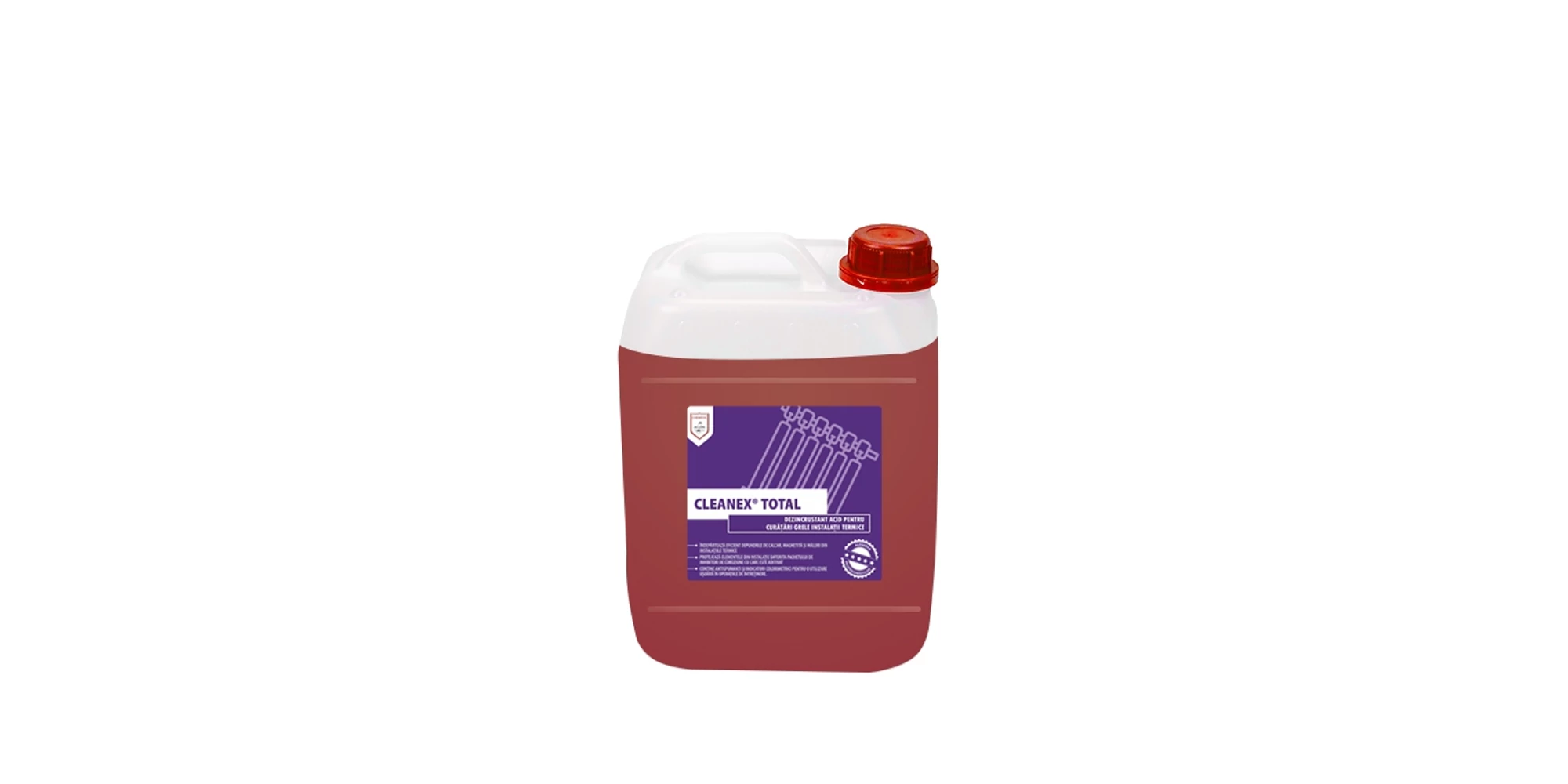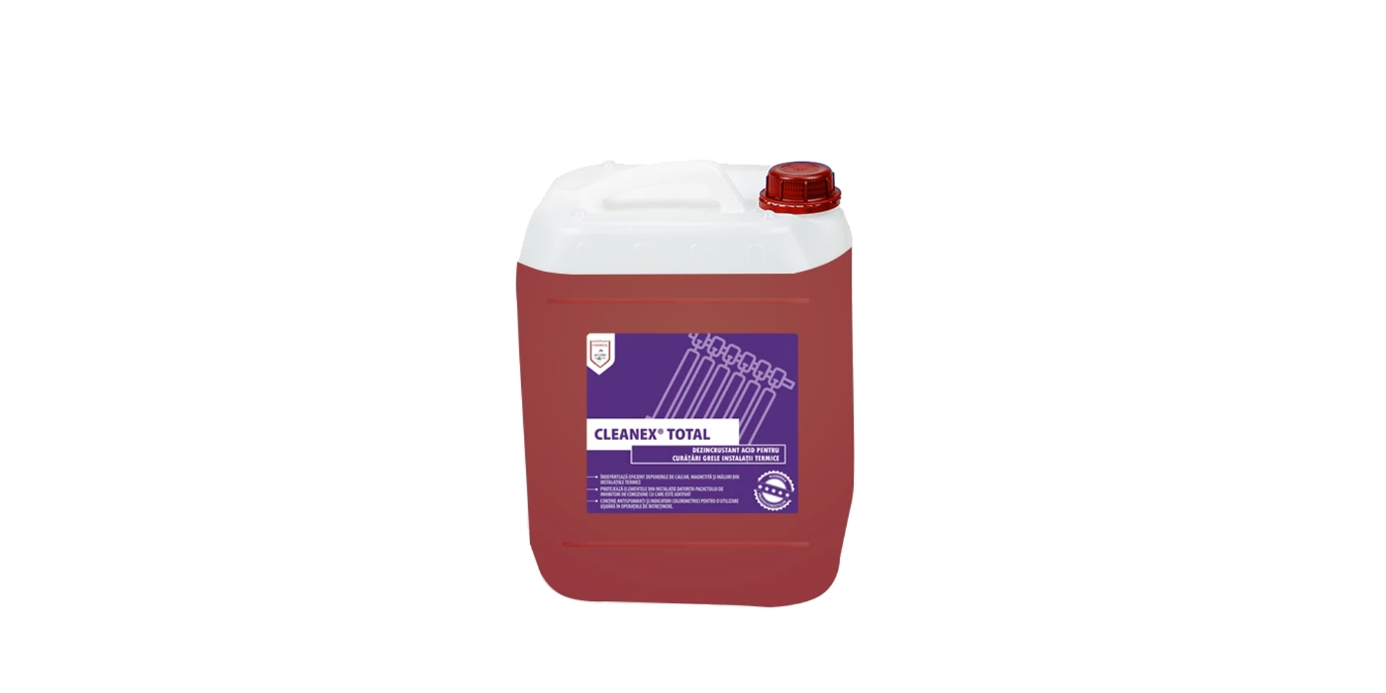 Soluție chimică dezincrustare acid pentru instalații termice CLEANEX TOTAL este destinată curățărilor grele ale schimbătoarelor de căldură și boilerelor care prezintă depuneri de calcar, precum și pentru curățarea întregii instalații care, în afară calcarului prezintă și depuneri de oxizi, magnetită și măluri.