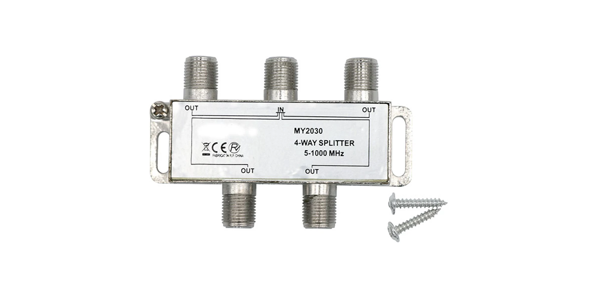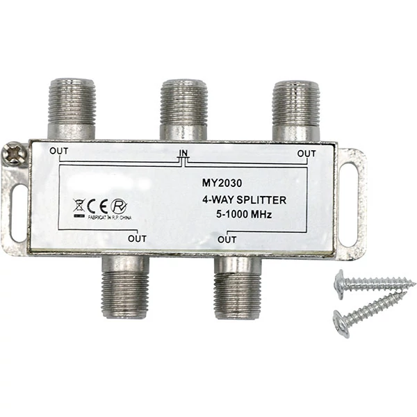 Splitter pentru TV 5-1000 MHz 4 ieșiri are 1 intrare și 4 ieșiri. Conectoarele pentru intrare și ieșirile sunt de tip F. Este recomandat pentru conexiuni CAI & SAT.