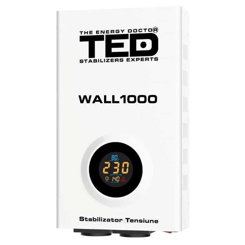 Stabilizator tensiune 1000VA, AVR, 600 W, display LCD, 2 ieșire schuko, montaj pe perete, TED000057, TED este un stabilizator de tensiune electrică maxim 1000VA / 600W, pentru aparate electrice, motoare electrice, frigidere, televizoare, centrale termice, centrale electrice, pompe, lumini, etc. Stabilizatorul reglează tensiunea electrică din rețea atunci când aceasta are fluctuație și astfel va protejează aparatura la care este conectat.