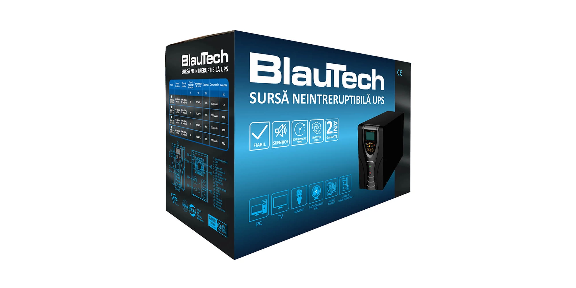 Din perspectiva fizică, sursa neîntreruptibilă BlauTech are o masă netă de 12 kg, fiind suficient de ușoară pentru a fi amplasată și mutată cu ușurință în diverse locații. Gama sa extinsă de temperatură de operare, de la 0°C până la 40°C, și temperatura de depozitare cuprinsă între -15°C și 55°C, o fac potrivită pentru utilizare în medii diverse și exigente.