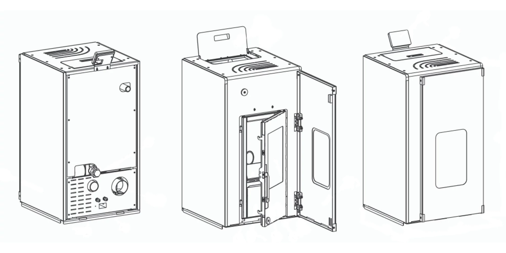 Arzător pe peleţi, buncăr de peleţi, pompă de circulație și vas de expansiune incorporat.