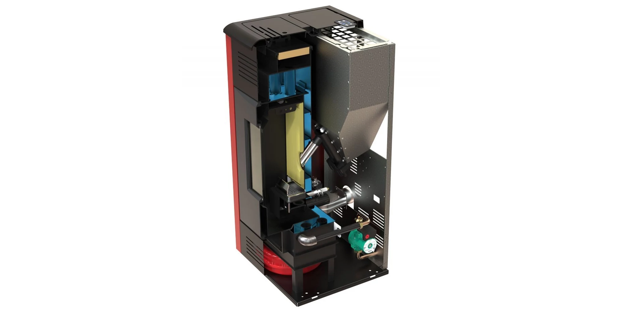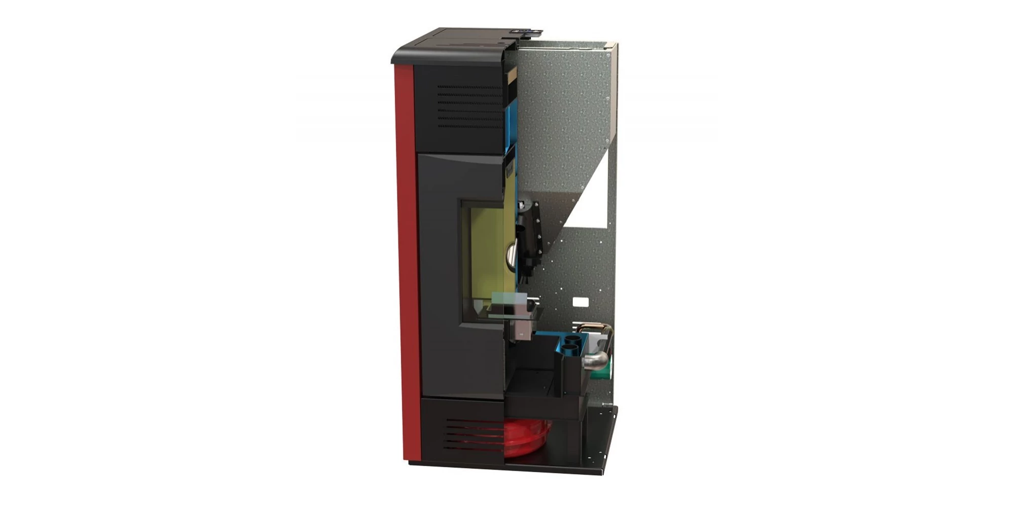 Sistemul de control al termoșemineului modulează viteza ventilatorului de evacuare, monitorizează presiunea în sistemul de încălzire și oprește automat termoșemineul când nu mai este combustibil în rezervorul incorporat.