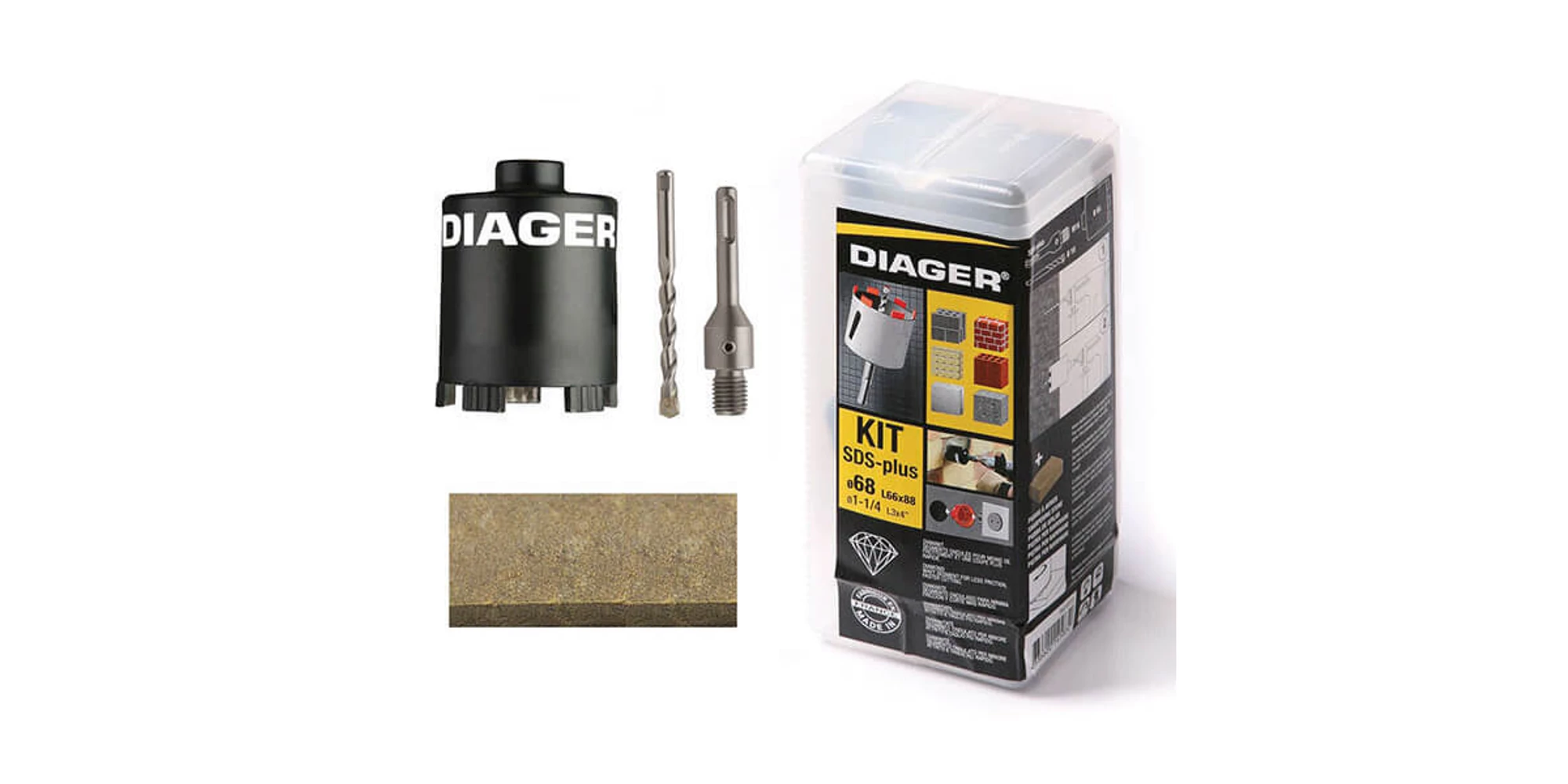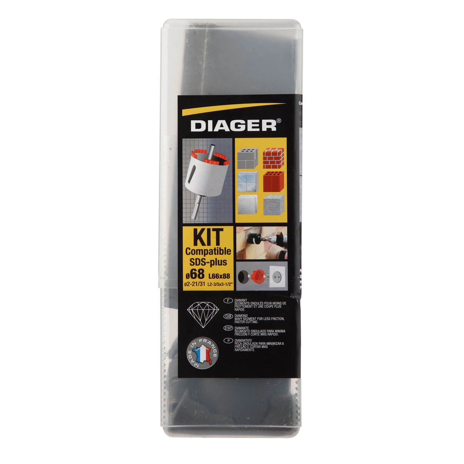 Trusă carote pentru electrician 5 piese, Ø 68 + adaptor compatibil SDS-plus L100 mm + burghiu de centrare + piatră de ascuțit DIAGER