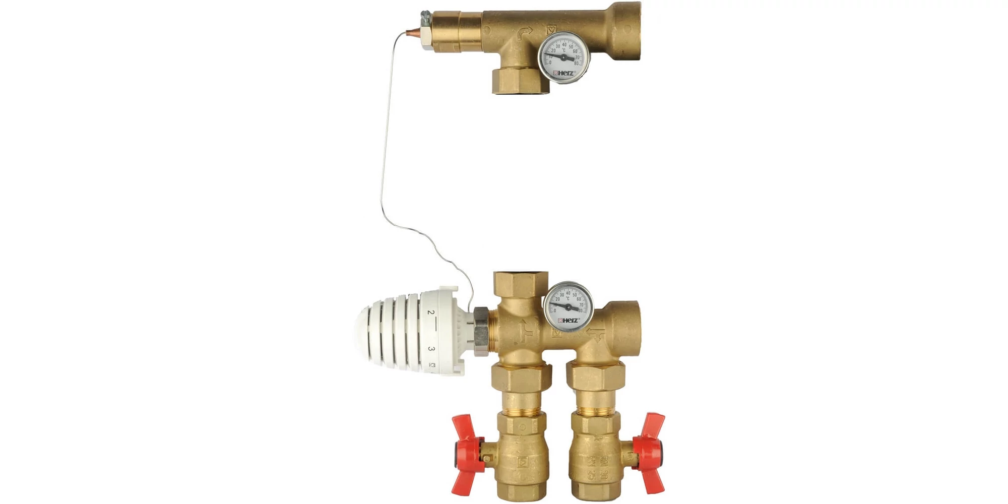Unitatea reglare temperatură HERZ 1732007 constă din vană de amestec cu cap termostatic, clapetă de sens, distanțier, manșon de imersie, termostat de comandă cu contact direct, două racorduri olandeze și două robinete cu sfera cu racorduri olandeze.